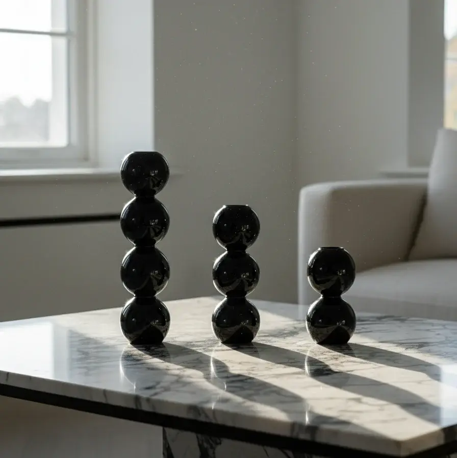 The Black Gloss Orb Vases embody modern simplicity with a bold sculptural twist.Each vase features stacked spherical forms that create a smooth, balanced silhouette. The deep glossy black finish enhances their reflective charm, adding depth and sophistication to any setting.