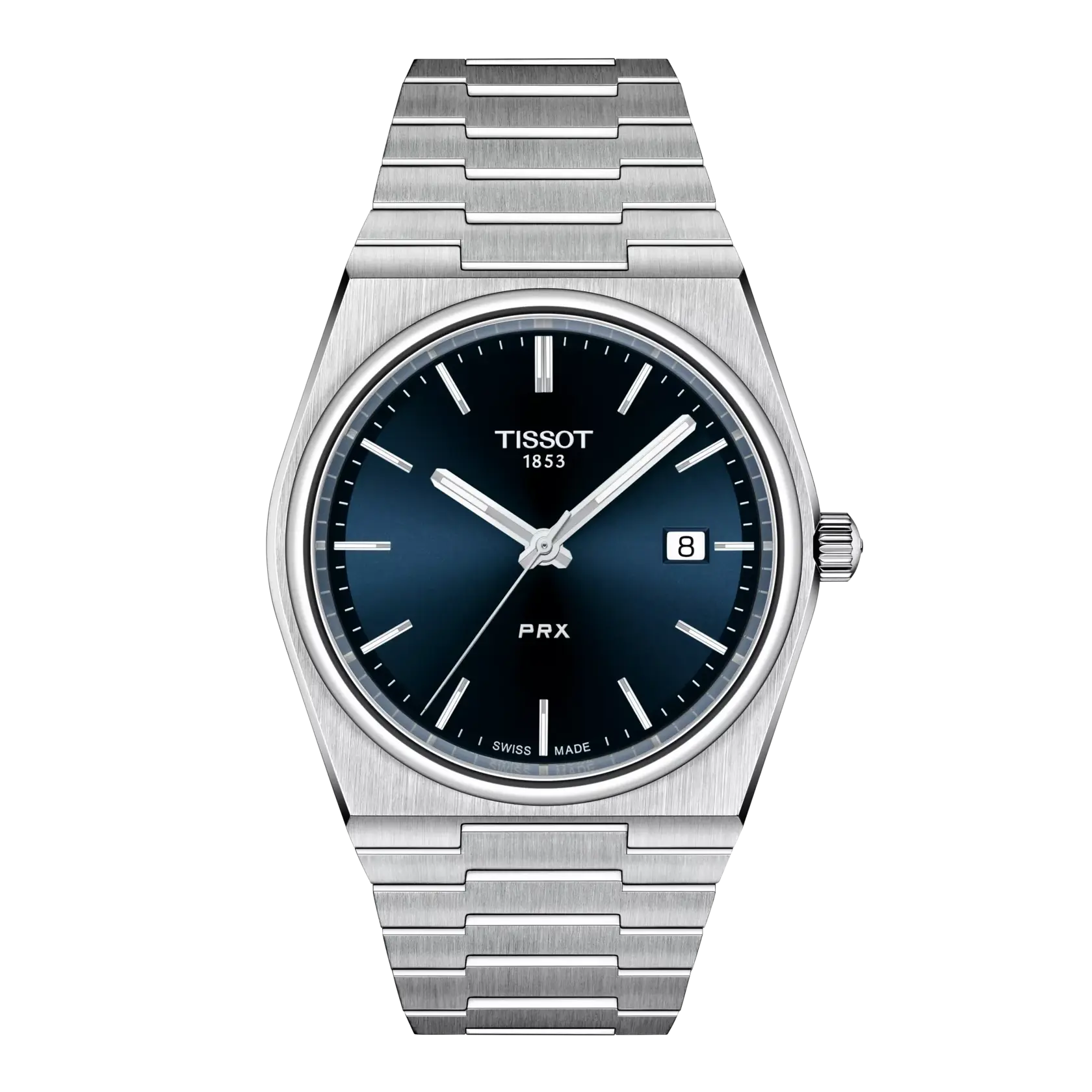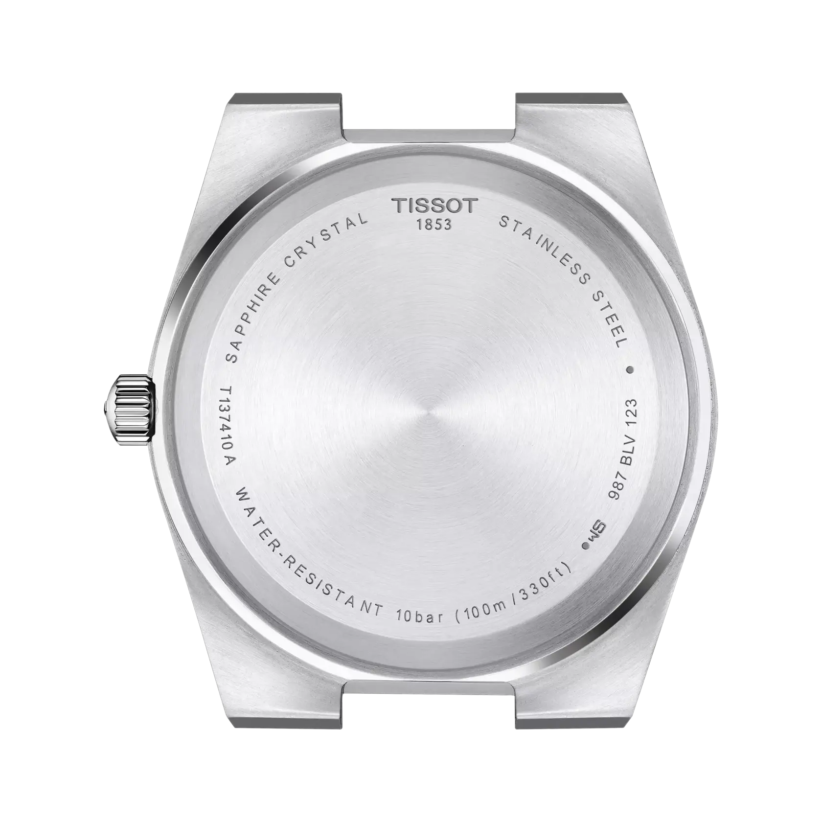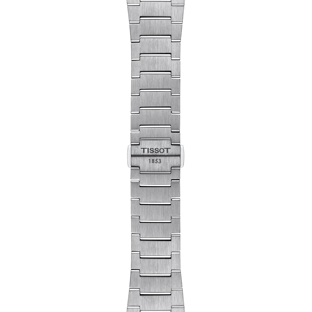 Case Shape: Tonneau Case Size: 40 x 39.5 mm Thickness: 10.4 mm Lug Width: 12 mm Water Resistance: 100 meters (10 bar / 330 ft) Case Material: 316L stainless steel Crystal: Scratch-resistant sapphire Movement: Swiss Quartz Battery: Renata 371 Functions: EOL (End-of-life indicator) Caliber: 11 1/2''' (Diameter: 25.6 mm) Dial Color: Blue Indexes: Index hour markers Luminescence: Super-LumiNova® on hands Bracelet Reference: T605046447 Bracelet Material: Stainless steel (Grey) Clasp: Butterfly clasp with push-buttons Bracelet Link Reference: T613046518 Bracelet: Quick release interchangeable system