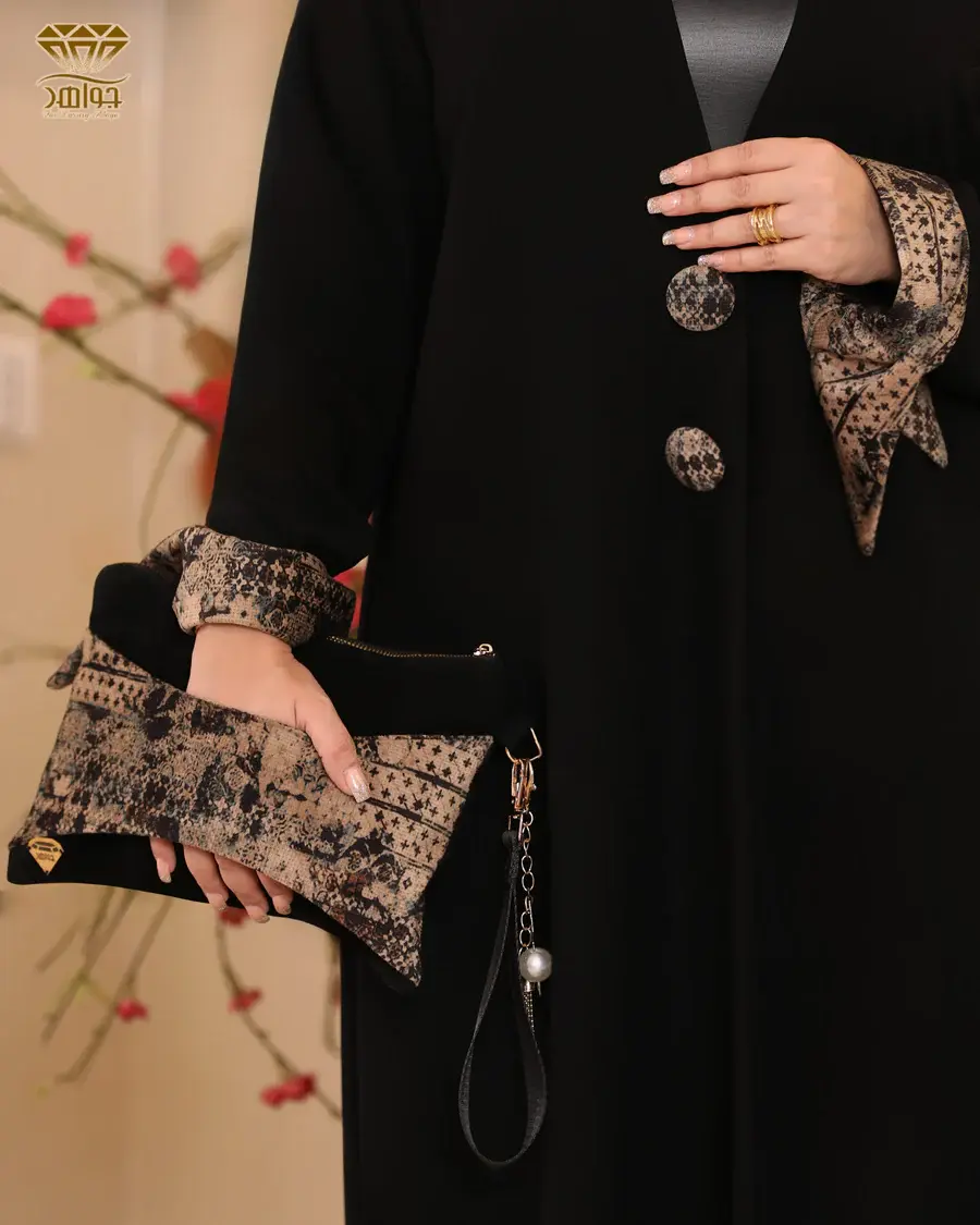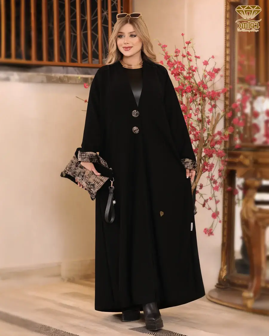 عباية بتصميم فخم ومُختلف، مصنوعة من خامة برلين مستورد مع قلبة كم وزراير بخامة من المخمل الناعم المستورد بنقشة راقية، والزراير مزودة بكباسين للتحكم في فتح وغلق العباية، بإضافة بطانة داخلية ناعمة تُضيف ثبات وأناقة للتصميم.