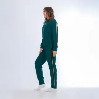 The top is a full-zip jacket with a built-in hoodie, side pockets, and contrasting side lines for a sporty look, while the matching pants feature coordinating side stripes for a complete, on-trend winter outfit. Whether you’re lounging, working from home, or enjoying a cozy evening in, this set blends function, comfort, and fashion effortlessly.