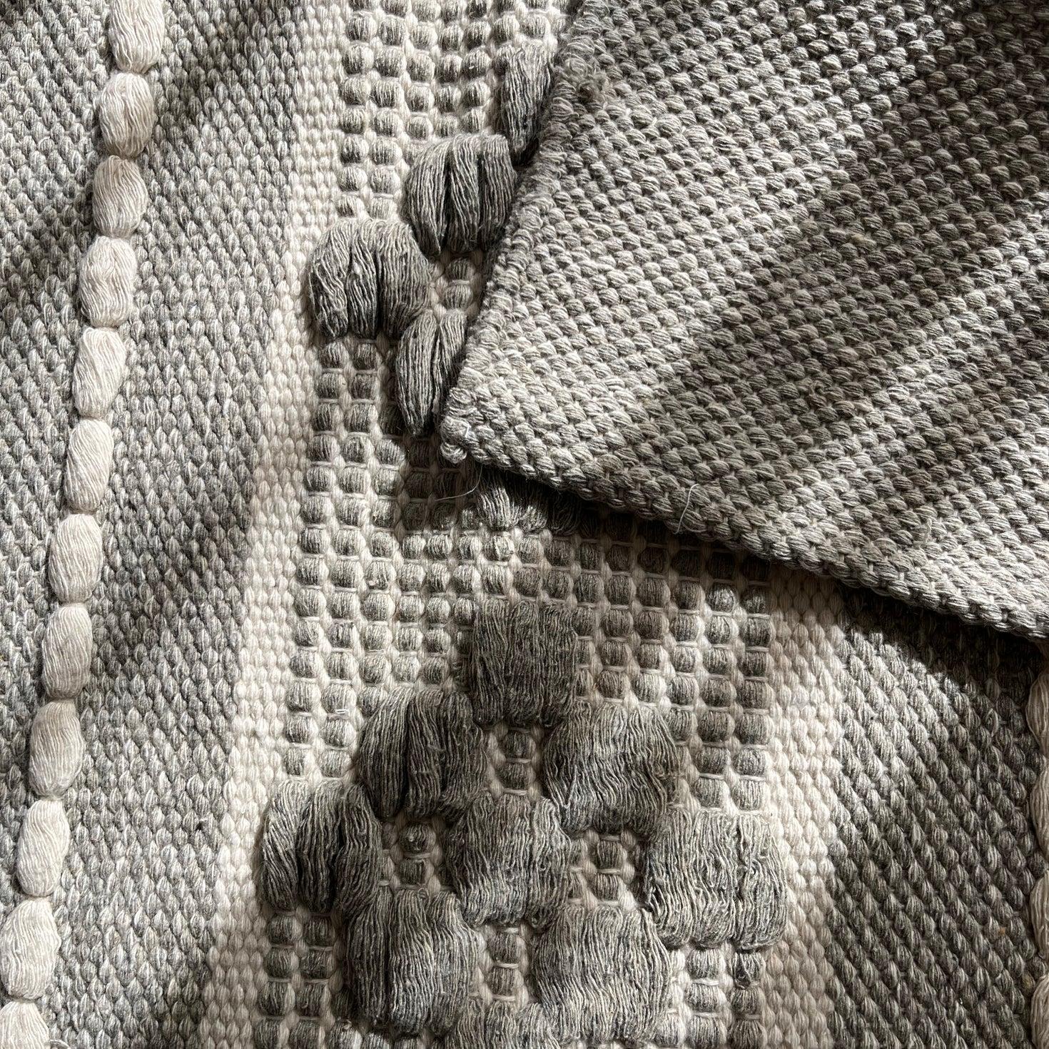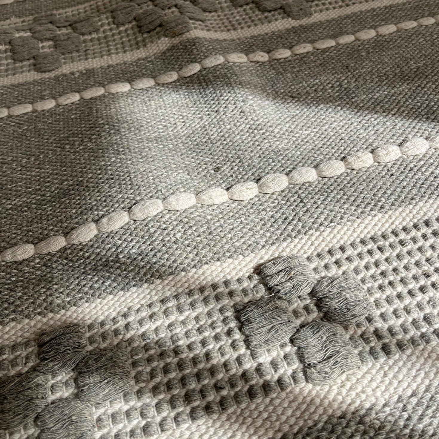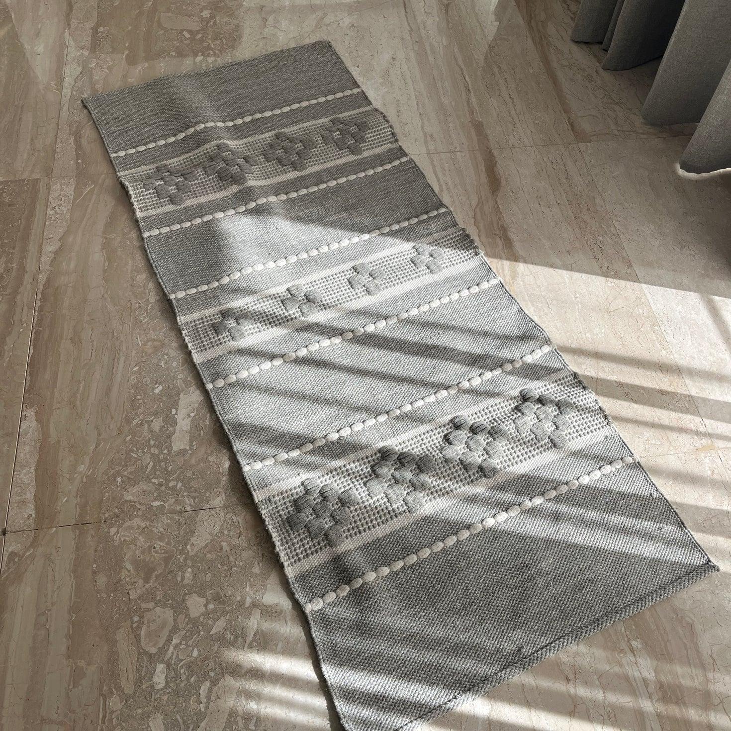 A calm and elegant grey kilim runner designed to bring softness and subtle texture to any room. It features raised woven motifs, dotted detailing, and a sturdy flat-weave base—all crafted from natural cotton. The neutral grey palette makes it easy to match with modern, minimal, or cozy interiors.